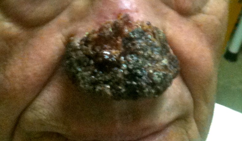 2. Puestos a inventar, podría decir que se trata de un granito que ha sangrado y alguien le ha ido dando toques con nitrato de plata, o un rinofima necrosadi, pero creo que la realidad es un carcinoma basocelular ulcerado y muy evolucionado. Saludos desde Málaga.