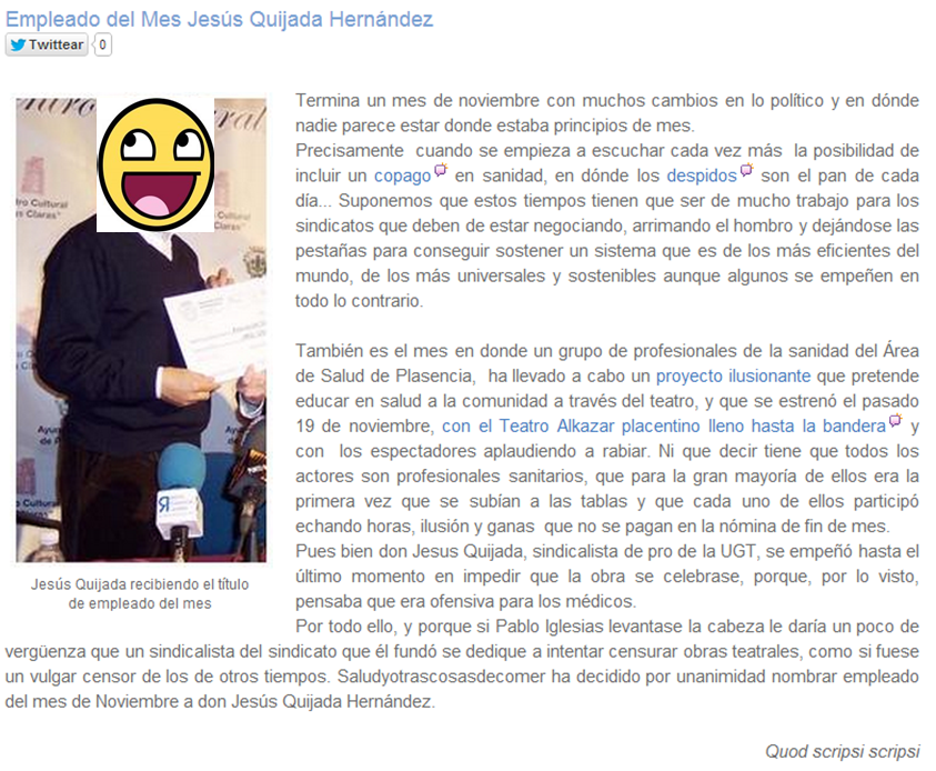 Por última vez este año 2012 al que los dioses mayas confundan, acude a su cita con nuestro blog la multitarea Cecilia Calvo. Desde el sur de Madrid, allí donde un dos de mayo de 1808 Andrés Torrejón lanzó su bando y donde nuestros compañeros hoy día libran la que no sabemos si será la primera o la última batalla, nos trae resumida la actualidad farmacoterapéutica de Twitter. Os dejo con ella.